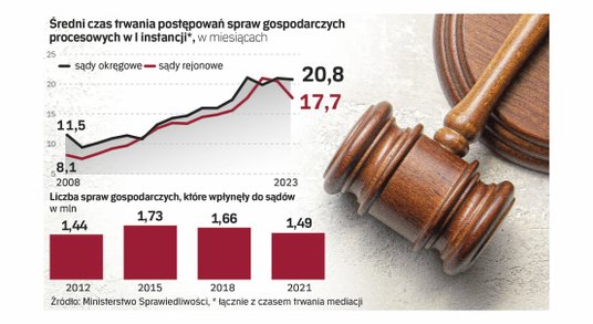 Jak pokazują statystyki, cel, jaki sobie postawił rząd PiS, przywracając postępowanie gospodarcze, nie został osiągnięty – średni czas trwania takich postępowań ciągle rośnie (w ub. roku nieznacznie spadł, ale nadal jest dłuższy niż przed reformą k.p.c.). A napływ spraw gospodarczych na przykład w latach pandemii był wyraźnie niższy niż przed reformą. Najdłużej trwają spory związane z umowami na roboty budowlane. Rekordowy, dotyczący budowy farmy wiatrowej, trwał prawie dekadę.