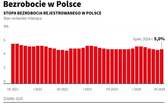 Stopa bezrobocia zarejestrowanego wyniosła 5 proc. na koniec lipca br. wobec 4,9 proc. miesiąc wcześniej, podał Główny Urząd Statystyczny (GUS). W lipcu 2023 r. stopa ta wyniosła 5 proc. Liczba zarejestrowanych bezrobotnych w końcu lipca 2024 r. wyniosła 765,4 tys. wobec 762,2 tys. miesiąc wcześniej.