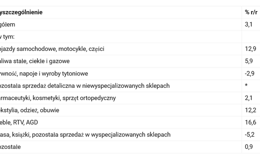 Sprzedaż detaliczna (w cenach stałych) wzrosła o 3,1% r/r w listopadzie 2025 r., podał Główny Urząd Statystyczny (GUS). W ujęciu miesięcznym odnotowano spadek o 3,3%.