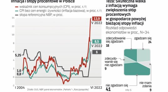 Nawet taki wzrost stóp procentowych (tych oficjalnych, ustalanych przez NBP, oraz tych rynkowych, jak WIBOR), jaki jest obecnie oczekiwany na rynku finansowym, oznaczałby, że jeszcze długo pozostawałyby one poniżej stopy inflacji – czyli byłyby ujemne w ujęciu realnym. Inflacja w czerwcu, jak oszacował wstępnie GUS, wyniosła bowiem 13,9 proc. rok do roku i – jak prognozują ekonomiści – do końca roku nie spadnie poniżej 12 proc. Powyżej 10 proc. może się utrzymywać także przez dużą część 2023 r.