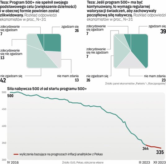 Brak ich waloryzacji oznaczałby, że rząd w praktyce godzi się na wygaszenie programu, który jest jego wizytówką. Ale podwyższenie świadczenia, aby odzyskało początkową siłę nabywczą, nie tylko byłoby kosztowne (można szacować, że waloryzacja o 200 zł podniosłaby roczne wydatki na ten program o ok. 16 mld zł, do 57 mld zł), ale też – podtrzymując popyt konsumpcyjny – utrwalałoby inflację.