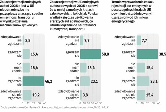 Czy termin wprowadzenia zakazu rejestracji aut emisyjnych w poszczególnych krajach UE powinien być zróżnicowany i uzależniony od ich miksu energetycznego? Z taką tezą zgodziło się 46 proc. ankietowanych przez nas ekonomistów. Przeciwnego zdania było niespełna 39 proc.