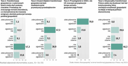 Ekonomiści są niemal jednomyślni, że przystąpienie do UE w 2004 r. znacząco przyspieszyło tempo wzrostu gospodarczego Polski (nie zgadza się z tym tylko dwóch uczestników ankiety, a jeden nie ma zdania). Opinie o znaczeniu prywatyzacji nie są już tak jednomyślne. Ze stwierdzeniem, że dużym błędem transformacji gospodarczej było niedokończenie prywatyzacji firm, zgodziła się nieco więcej niż połowa ekspertów.