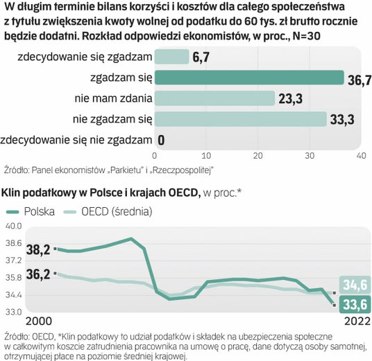 Z tezą, że „w długim terminie bilans korzyści i kosztów dla całego społeczeństwa z tytułu zwiększenia kwoty wolnej od podatku do 60 tys. zł brutto rocznie będzie dodatni”, zgodziło się 43 proc. spośród 30 ekonomistów, którzy wzięli udział w naszym badaniu opinii. Niespełna 7 proc. zgodziło się zdecydowanie. Grupa krytyków podwojenia kwoty wolnej również jest dość liczna: jedna trzecia ankietowanych ekonomistów sądzi, że koszty przewyższą korzyści. Ale żaden z uczestników sondy nie ma co do tego pełnego przekonania.