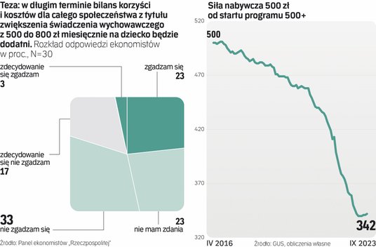 Spośród trzydziestu uczestników panelu ekonomistów „Rzeczpospolitej”, którzy wzięli udział w naszej przedwyborczej sondzie, tylko ośmioro (niespełna 27 proc.) zgodziło się z tezą, że „w długim terminie bilans korzyści i kosztów dla całego społeczeństwa z tytułu zwiększenia świadczenia wychowawczego z 500 do 800 zł miesięcznie na dziecko będzie dodatni”. Przeciwnego zdania jest 50 proc. ankietowanych.