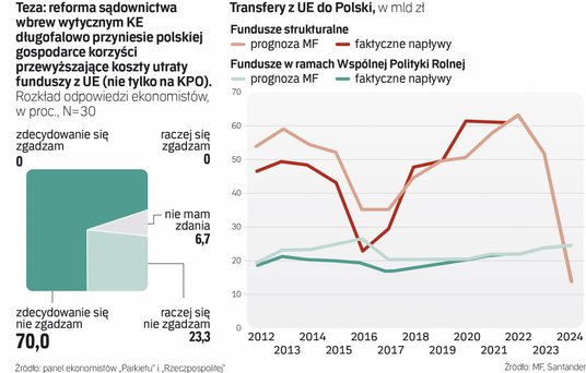 Ze względu na potencjalnie istotne gospodarcze implikacje reformy sądownictwa, którą chce forsować PiS, uwzględniliśmy ten postulat w sondzie wśród uczestników panelu ekonomistów „Rzeczpospolitej” na temat kluczowych gospodarczych elementów z programów wyborczych partii politycznych. Wyniki są jednoznaczne: żaden z ankietowanych nie uznał, że zmiany w sądownictwie są w Polsce tak potrzebne, że uzasadniałyby nawet rezygnację z unijnych funduszy.
