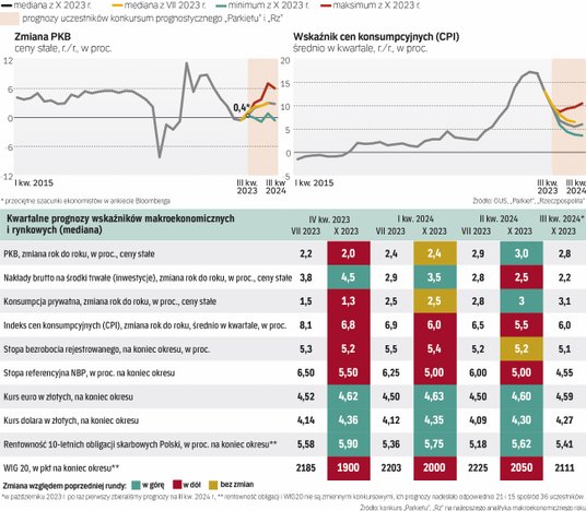 Efektem ubocznym będzie jednak wciąż wysoka inflacja. Analitycy wskazują, że wzrost cen zwolni z 6,8 proc. w IV kwartale 2023 r. do 6 proc. w III kw. 2024 r. Inflację podwyższało będzie wygaszanie tzw. tarcz antyinflacyjnych. Równocześnie rosnąć będą ceny usług, co bezpośrednio związane jest z dwucyfrowym wzrostem wynagrodzeń. Ryzyko dla prognoz wciąż stanowi sytuacja na rynkach energetycznych – szczególnie w kontekście licznych zawirowań na Bliskim Wschodzie.