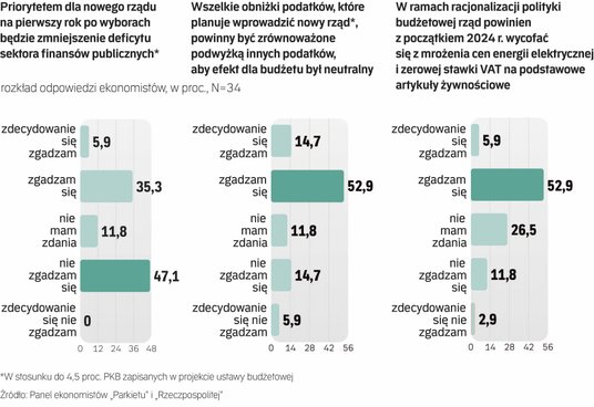 Według szacunków Ministerstwa Finansów przekazanych Komisji Europejskiej, w tym roku deficyt sektora finansów publicznych wyniesie 5,6 proc. PKB, najwięcej od 2010 r. W kolejnym roku, jak zapisano w projekcie ustawy budżetowej, ma zmaleć do 4,5 proc. PKB, ale wielu ekonomistów uważa, że jest to przykład myślenia życzeniowego. W projekcie brakuje bowiem części wydatków, które zaplanował obecny rząd. To postawi w trudnej sytuacji nowy gabinet, który chciałby dołożyć kolejne wydatki, choćby podwyższając płace dla nauczycieli, ale też obniżyć podatki – np. podwajając kwotę wolną od PIT. Odstąpienie od tych obietnic oznaczałoby prawdopodobnie szybką utratę jego wiarygodności.