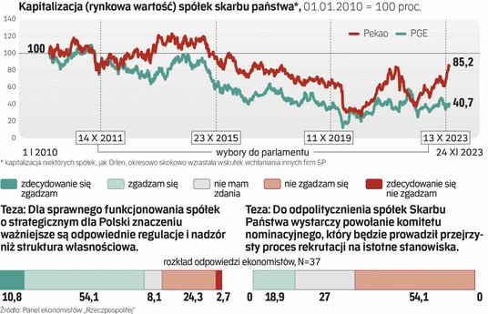 Perspektywa zmiany rządu wywołała euforię na warszawskiej giełdzie. W ciągu niespełna dwóch miesięcy WIG20, indeks grupujący największe spółki, wzrósł o 20 proc. Przyczyniły się do tego w dużej mierze zwyżki cen akcji spółek Skarbu Państwa. Inwestorzy najwyraźniej liczą na ich odpolitycznienie, czego efektem mogłaby być większa koncentracja na wynikach.