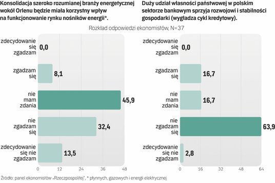 Nawet ci ekonomiści, którzy podzielają te argumenty, dostrzegają jednak koszty takiej konsolidacji. W rezultacie z tezą, że „konsolidacja szeroko rozumianej branży energetycznej wokół Orlenu będzie miała korzystny wpływ na funkcjonowanie rynku nośników energii”, zgodziło się zaledwie 8 proc. spośród 37 ekonomistów, którzy wzięli udział w naszej sondzie. Co więcej, żaden z nich nie był co do tego w pełni przekonany. Tymczasem 46 proc. respondentów odrzuciło tę tezę, w tym niemal 14 proc. zdecydowanie. Wyjątkowo dużo uczestników sondy, aż 46 proc., nie ma jednak w tej sprawie wyrobionego zdania.