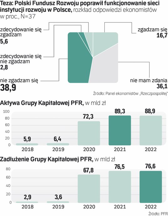 Uczestników panelu ekonomistów poprosiliśmy o ocenę tezy, że „Polski Fundusz Rozwoju poprawił funkcjonowanie sieci instytucji rozwoju w Polsce”. Aż 36 proc. spośród 37 ankietowanych wybrało odpowiedź „nie mam zdania”. Z tym sformułowaniem zgodziło się 22 proc. ankietowanych, w tym 6 proc. zdecydowanie. Nie zgodziło się z nim 42 proc. ankietowanych. Ale zdecydowanie krytyczny głos był tylko jeden.
