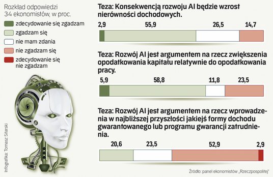Z tezą, że „konsekwencją rozwoju AI będzie wzrost nierówności dochodowych” zgodziło się 59 proc. spośród 34 ekonomistów, którzy wzięli udział w naszej sondzie. Ale zdecydowanych zwolenników tej tezy praktycznie nie było, co świadczy o tym, że wpływ AI na rozwarstwienie dochodowe nie jest dziś przesądzony.
