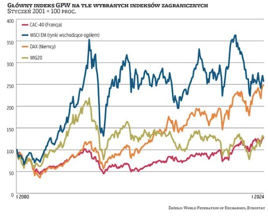 Tej świetności GPW nigdy już nie odzyskała. Nawet po bardzo udanym dla rynku akcji 2023 r. kapitalizacja notowanych na warszawskiej giełdzie spółek wynosiła około 24 proc. PKB. Patrząc inaczej: w 2023 r. polska gospodarka była o 190 proc. większa (nominalnie) niż w 2007 r., pomimo kryzysu i późniejszej pandemii Covid-19. Polski rynek akcji urósł zaś tylko o 60 proc.