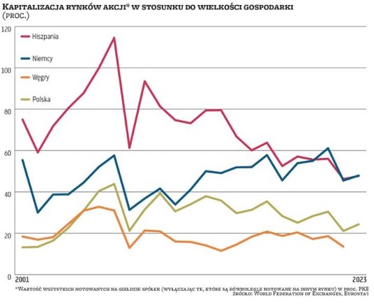 Nawet w Hiszpanii, gdzie kryzys finansowy zakończył potężną bańkę na giełdzie, rynek akcji zdołał częściowo odzyskać blask. W 2007 r. kapitalizacja spółek notowanych na hiszpańskich parkietach (czterech) wynosiła 114 proc. PKB, rok później 61 proc., ale później przez wiele lat oscylowała wokół 80 proc. – Według danych Banku Światowego łączna kapitalizacja krajowych spółek znajdujących się na warszawskiej giełdzie znajduje się w stagnacji od 2004 r., orbitując wokół 30 proc. PKB. Dla porównania średnia dla krajów rozwiniętych wzrosła z 98 proc. w 2004 r. do 169 proc. w 2020 r. Wynik Polski jest dwukrotnie słabszy od średniej dla krajów o średnim poziomie dochodu (ok. 60 proc. PKB). Wpisuje się natomiast w słabe wyniki rejonu Europy Środkowej – zauważa Marcin Klucznik, analityk z Polskiego Instytutu Ekonomicznego. Kapitalizacja giełdy w Budapeszcie w 2022 r. (to ostatnie dostepne dane) wynosiła zaledwie 13,5 proc. PKB Węgier, podczas gdy w szczytowym momencie – również przed globalnym kryzysem finansowym - przekraczała 30 proc.