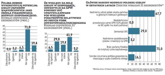 W sondzie udział wzięło 31 obserwatorów polskiej gospodarki. I zaledwie jeden z nich zgodził się z tezą, że „Polska dobrze wykorzystuje potencjał giełdy papierów wartościowych jako źródła finansowania rozwoju gospodarczego”. Aż 28 ankietowanych (90 proc.) nie zgodziło się z tym twierdzeniem, w tym sześciu odrzuciło je zdecydowanie.