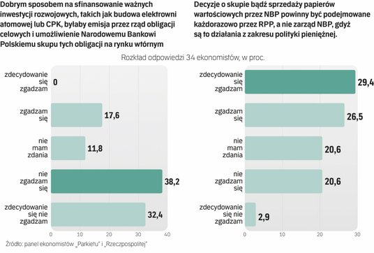 Spośród 34 ekonomistów, którzy wzięli udział w tej sondzie, aż 71 proc. nie zgodziło się z tezą, że „dobrym sposobem na sfinansowanie ważnych inwestycji rozwojowych (...), byłaby emisja przez rząd obligacji celowych i umożliwienie NBP skupu tych obligacji na rynku wtórnym". Przy tym, ponad 30 proc. ankietowanych odrzuciło ten pomysł, a żaden nie wyraził dla niego zdecydowanej aprobaty.