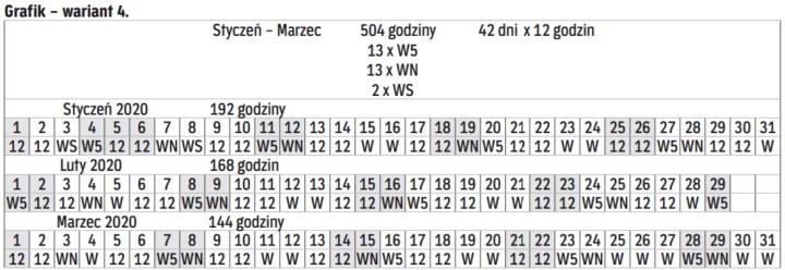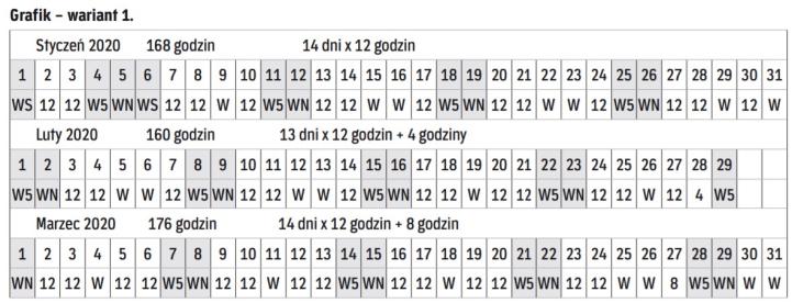 Takie planowanie czasu pracy przez kierownika nie jest błędne i nie narusza przepisów o czasie pracy. Może jednak świadczyć o niepełnym zrozumieniu zasad planowania czasu pracy w okresie rozliczeniowym. Gdy obejmował on miesiące styczeń – marzec 2020 r., należało ustalić pełną pulę godzin przypadających do przepracowania w całym tym okresie, a zatem 504 godziny. Dzieląc tę liczbę godzin przez 12 kierownik zorientowałby się, że ma w puli do zaplanowania pracownikom 42 zmiany 12-godzinne i nie musi dzielić dniówek na 4- i 8-godzinne.