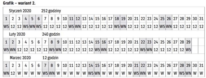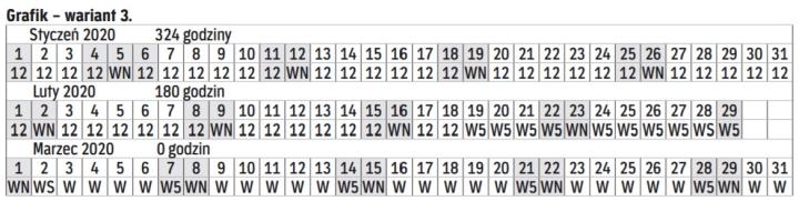 W tym przypadku kierownik planując grafik na styczeń 2020 r. miał spore problemy kadrowe spowodowane dużą liczbą nieobecnych pracowników. Musiał zatem pozostałymi pracownikami wydziału wykonać zamówienia w zaplanowanych terminach. Dlatego w styczniu planował pracę pracowników zważając jedynie na zapewnienie im w każdej dobie 11 godzin nieprzerwanego odpoczynku oraz 35-godzinnego odpoczynku tygodniowego. Ponieważ w zakładzie jest dopuszczalna praca zmianowa, mógł planować pracownikom pracę również w niedzielę i święta. Zaplanował w styczniu 324 godziny pracy planując 12-godzinne dniówki od poniedziałku do soboty włącznie, nie wyłączając święta 1 i 6 stycznia. Takie zaplanowanie czasu pracy nie jest błędne, gdyż 40-tygodniowa norma czasu pracy jest przeciętna i obliczana w całym okresie rozliczeniowym. Odpoczynki dobowe i tygodniowe zostały zachowane. W lutym kierownik nadal kontynuował planowanie pracy po 12 godzin przez 6 kolejnych dni w tygodniu aż do wyczerpania 504-godzinnej puli dla okresu rozliczeniowego. 18 lutego liczba godzin przypadająca do przepracowania w tym okresie rozliczeniowym się wyczerpała i kierownik nie mógł już zaplanować w grafiku do końca okresu rozliczeniowego ani jednej godziny pracy. Mógł jedynie polecać pracę w godzinach nadliczbowych. Po wyczerpaniu wszystkich godzin kierownik musi się niejako rozliczyć w grafiku z dni wolnych od pracy, dlatego zaplanował pracownikom na 19, 20, 21, 24, 25, 26 i 27 lutego W5, czyli dni wolne wynikające z przeciętnie pięciodniowego tygodnia pracy, które wcześniej były planowane jako pracujące. Następnie na 28 lutego i 2 marca zaplanował w grafiku WS, czyli dni wolne z tytułu święta, czym oddał pracownikom wcześniej zaplanowane jako pracujące dni 1 i 6 stycznia. Pozostałe dni w marcu (od poniedziałku do piątku) będą już dniami wolnymi wynikającymi z równoważenia czasu pracy pracowników. Planowanie pracy w tym grafiku również jest prawidłowe.