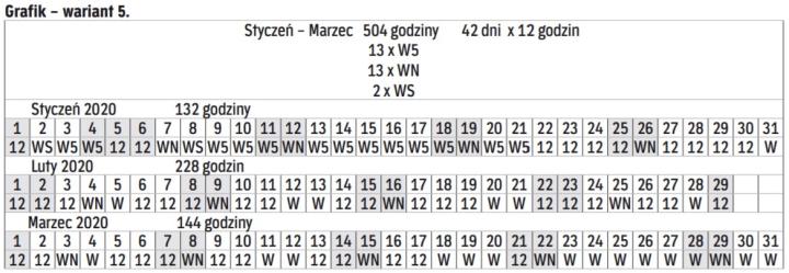 W przypadku grafiku w wariancie 5 potrzeby produkcyjne kierownika były zupełnie inne. Pod koniec 2019 r. wiedział, że zapotrzebowanie na produkcję jego wydziału w pierwszych dwóch tygodniach stycznia będzie bardzo niewielkie. Dlatego postanowił zaplanować w styczniu pracownikom wszystkie dni wolne wynikające z przeciętnie pięciodniowego tygodnia pracy (sobota) z całego okresu rozliczeniowego. Zatem 13 sobót przypadające w tych trzech miesiącach zostały pracownikom zaplanowane jako dni wolne W5 już w styczniu. To spowodowało, że kierownik w kolejnych miesiącach okresu rozliczeniowego miał do dyspozycji wszystkie pozostałe soboty, które mógł planować jako robocze. Zasada przeciętnie pięciodniowego tygodnia pracy w okresie rozliczeniowym została zachowana.