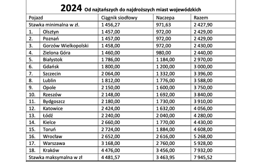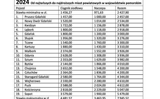 Przedstawiamy tabele rankingowe, gdzie pojazdem porównawczym jest typowy zestaw naczepowowy tzn. ciągnik siodłowy (2-osiowy) i naczepa (3-osiowa) o zawieszeniu pneumatycznym i dopuszczalnej masie całkowitej (dmc) równej 40 ton. MF określiło na 2024 rok stawki minimalne i maksymalne.