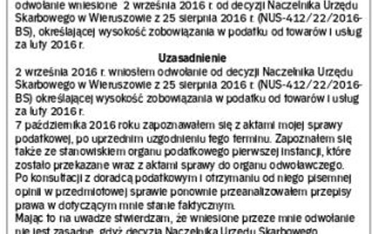 18 lipca 2016 roku naczelnik urzędu skarbowego wydał decyzję o określeniu Stanisławowi Wawrzycznemu, prowadzącemu działalność gospodarczą RRBU „Halibut", zobowiązania podatkowego w podatku od towarów i usług za luty 2016 roku. 25 lipca 2016 roku pan Stanisław złożył od tej decyzji odwołanie, które zostało następnie 2 sierpnia 2016 roku przekazane organowi odwoławczemu. 8 sierpnia 2016 roku podatnik zapoznawał się w siedzibie organu odwoławczego z aktami jego sprawy. Po konsultacji z doradcą podatkowym pan Stanis- ław zdecydował się na wycofanie odwołania. 9 sierpnia 2016 roku złożył wniosek o wycofanie odwołania, wpłacając jednocześnie kwotę VAT wynikającą z decyzji organu pierwszej instancji.
