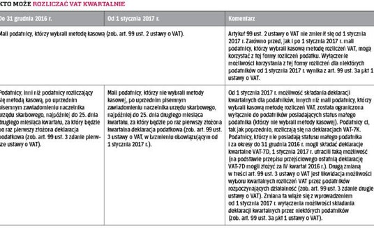Nowelizacja przepisów o VAT znacznie ograniczyła krąg podmiotów uprawnionych do rozliczania VAT co trzy miesiące. Podatnicy, którzy mogą składać deklaracje kwartalne VAT-7K w urzędzie skarbowym w terminie do 25. dnia miesiąca następującego po każdym kolejnym kwartale, zostali wymienieni w >tabeli obok.