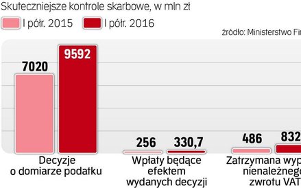Na razie Ministerstwo ma powody do zadowolenia. Dochody podatkowe w pierwszym półroczu 2016 r. wzrosły o 7,4 proc. w porównaniu z pierwszym półroczem ubiegłego roku. I choć Jasiński nie przypisał tego wzrostu wyłącznie kontrolom skarbowym, to statystyka pokazuje, że są efektywniejsze. Przez pierwsze sześć miesięcy tego roku kontrolerzy wydali decyzje nakładające podatek na kwotę prawie 9,6 mld zł, o 36,6 proc. więcej niż w pierwszej połowie 2016 r. Poprawiają się wyniki nie tylko w treści decyzji, ale z realnych wpłat podatków po kontrolach. Wyniosły 566,5 mln zł, co oznacza wzrost o 35,7 proc. w stosunku do pierwszej połowy 2015 r.