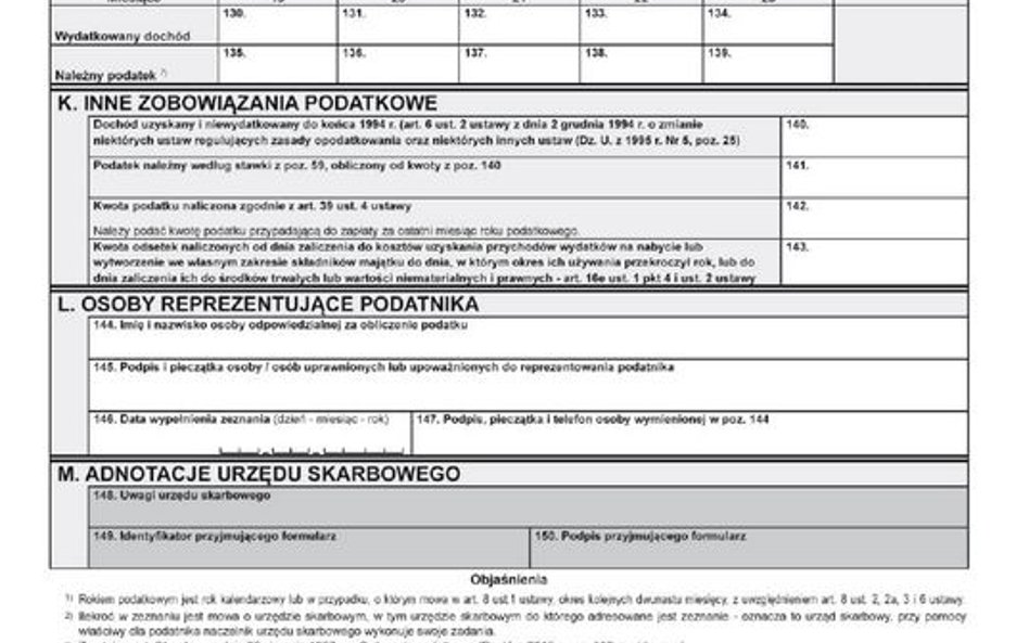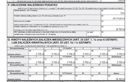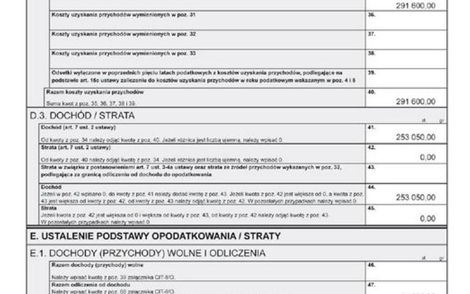 Uwzględniając powyższe zdarzenia spółka sporządziła kalkulację CIT za 2015 r. W zeznaniu CIT-8 wykazała przychody w wysokości 544 650 zł (poz. 30) oraz koszty uzyskania przychodów w kwocie 291 600 zł (poz. 35). Spółka odliczyła straty podatkowe z poprzednich lat oraz darowiznę w łącznej wysokości 44 tys. zł (poz. 47). Wobec tego podstawa opodatkowania wyniosła 209 050 zł (poz. 57), a należny podatek 39 720 zł (poz. 62). Po uwzględnieniu zapłaconych w ciągu roku zaliczek na podatek (poz. 88), spółka posiada zobowiązanie podatkowe w wysokości 7296 zł (poz. 92).