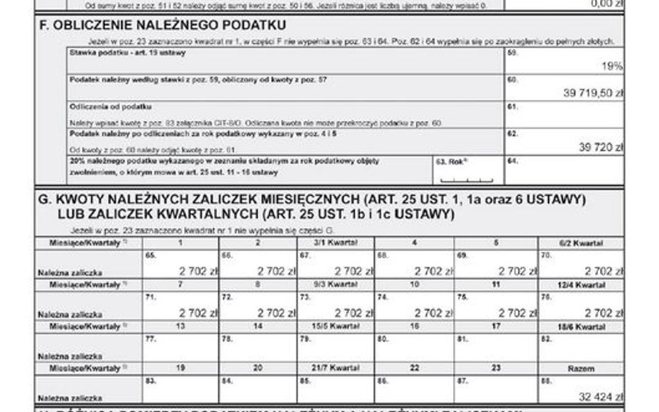 16. Spółka w ciągu roku podatkowego wpłacała zaliczki na CIT w formie uproszczonej, których miesięczną wysokość ustaliła jako 1/12 podatku wykazanego w zeznaniu za 2013 r. Łączna wartość wpłat na rachunek urzędu skarbowego w 2015 r. wyniosła 32 424 zł.