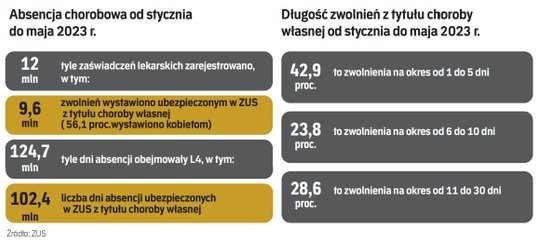 W tym czasie było ich łącznie 12 mln i opiewały na 124,7 mln dni. To więcej w porównaniu z tym samym okresem 2022 r. Wzrost widać zarówno w liczbie dni absencji chorobowej – o 3,8 proc., jak i liczby zaświadczeń lekarskich – o 7,9 proc.