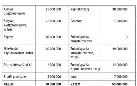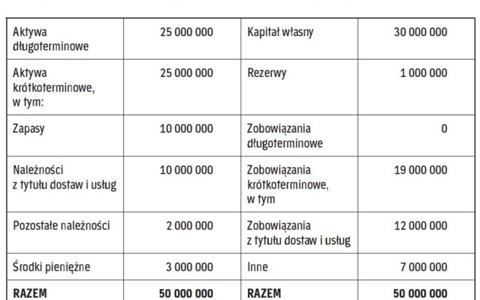Spółka posiada znaczne zobowiązania z tytułu dostaw i usług. Termin zapadalności 6 000 000 przypada wkrótce. Zarząd się zastanawia, czy spłatę sfinansować kredytem obrotowym czy może faktoringiem pełnym. Spółka jest członkiem grupy kapitałowej, w ramach której regularnie kontrolowane są podstawowe wskaźniki finansowe. Ustalono, że koszty obu rozwiązań byłyby porównywalne i wyniosłyby 200 000. Przeprowadzono symulację wartości bilansowych i podstawowych wskaźników w przypadku wykorzystania kredytu obrotowego oraz faktoringu pełnego: