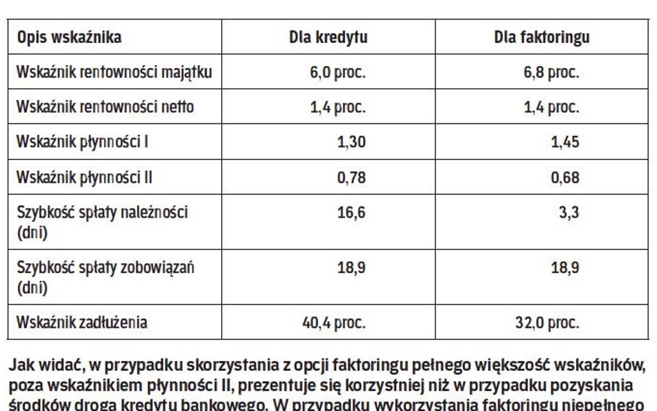W przykładzie przedstawiono, jaki wpływ na wskaźniki finansowe ma pozyskanie środków z kredytu obrotowego i alternatywnie – poprzez poddanie należności faktoringowi pełnemu.