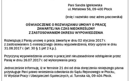 Odpowiadając zatem na pytanie czytelniczki: ma ona prawo wypowiedzieć umowę o pracę podwładnej z tego powodu, że odstąpiła ona od świadczenia zadań służbowych, ponieważ nie zgadzała się z decyzjami szefostwa dotyczącymi wewnętrznej firmowej polityki >patrz wzór oświadczenia woli pracodawcy o wypowiedzeniu. To nie pracownica mianowicie decyduje o tym, z kim zatrudniający może (albo nie może) nawiązać współpracę handlową i w jej ramach podpisać kontrakt. ?