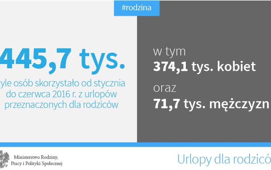 Od stycznia do czerwca 2016 r. z urlopów przeznaczonych dla rodziców skorzystało 445,7 tys. osób - 374,1 tys. kobiet oraz 71,7 tys. mężczyzn.
