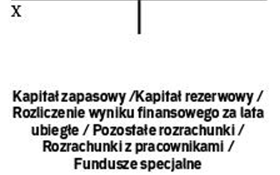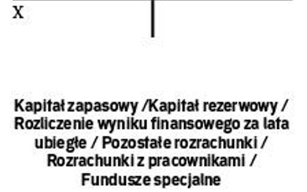 Ma „Kapitał zapasowy" lub „Kapitał rezerwowy" lub „Rozliczenie wyniku finansowego za lata ubiegłe" lub „Pozostałe rozrachunki" lub „Rozrachunki z pracownikami" lub „Fundusze specjalne".