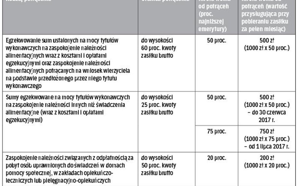 - 50 proc. kwoty najniższej emerytury – przy potrąceniu lub egzekwowaniu sum ustalonych na mocy tytułów wykonawczych na zaspokojenie należności wraz z kosztami i opłatami egzekucyjnymi oraz sum egzekwowanych na mocy tytułów wykonawczych na zaspokojenie należności innych niż alimentacyjne,