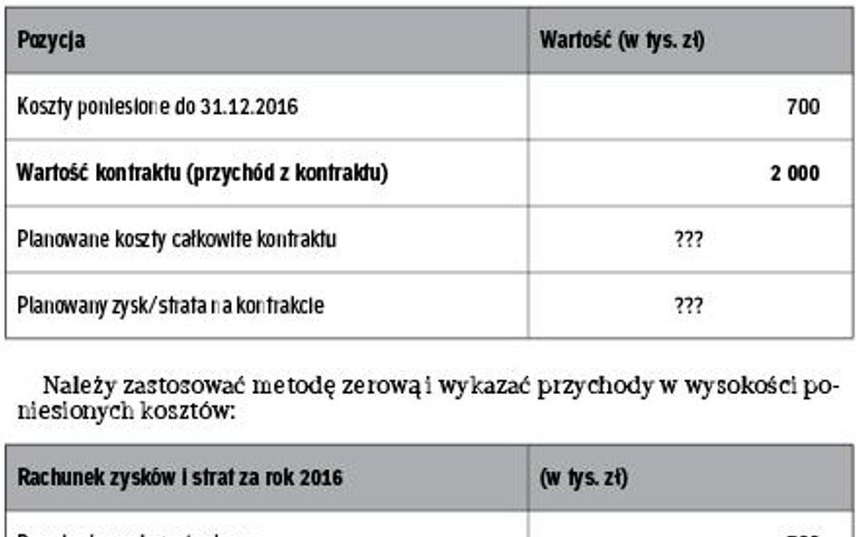 Ustawa wyraźnie wskazuje, co robić, jeśli nie możemy w sposób wiarygodny ustalić na dzień sporządzenia sprawozdania finansowego stopnia zaawansowania niezakończonej usługi, albo całkowitego kosztu jej wykonania. W takim przypadku przychód ustalany jest w wysokości poniesionych w danym okresie sprawozdawczym kosztów, nie wyższych jednak od kosztów, których pokrycie w przyszłości przez zlecającego usługę jest prawdopodobne. Jest to tak zwana metoda zerowa, gdyż wynik pokazany w sprawozdaniu finansowym z tytułu kontraktu w toku wyniesie zero.
