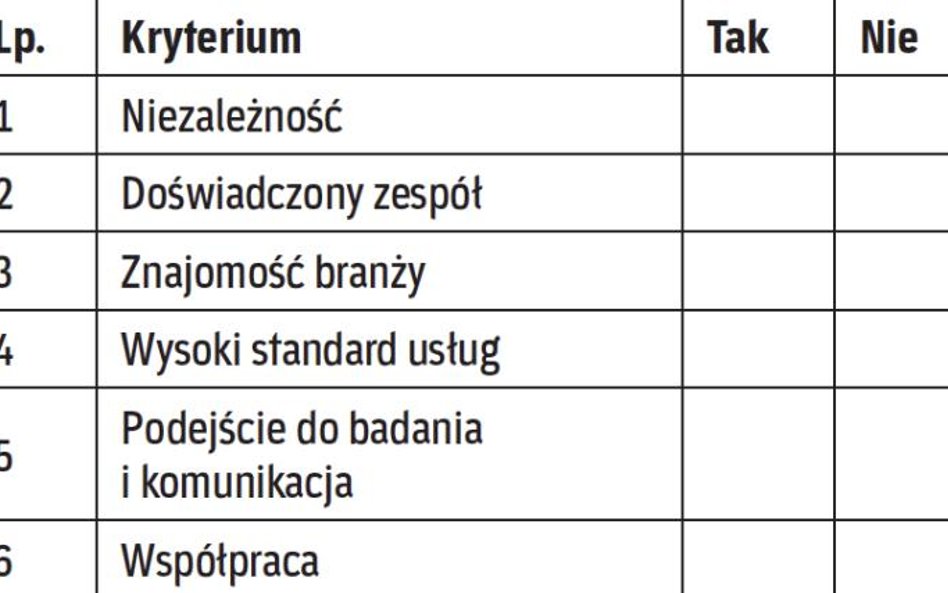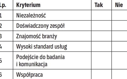 Najważniejsze przesłanki powinny dotyczyć metodologii badania, standardów świadczenia usługi, doświadczenia zespołu badającego i znajomości branży oraz możliwości kontaktu z ekspertami. Niestety, część założeń może zostać zweryfikowana dopiero w trakcie współpracy z konkretnym audytorem oraz zespołem badającym.