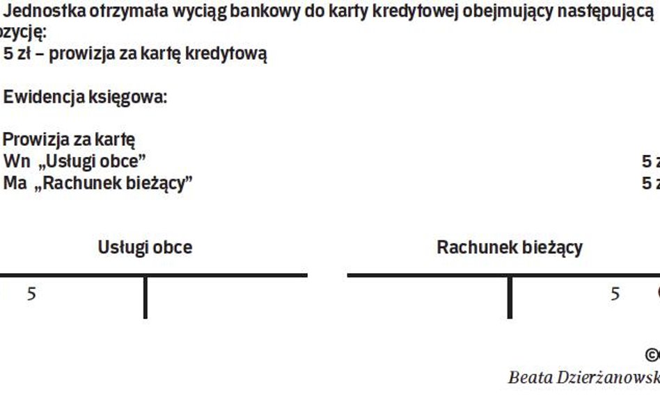 Wszelkie prowizje pobierane przez bank związane z kartą kredytową (opłata za kartę, opłata za przelew) widniejące na wyciągu bankowym powinny być księgowane jako koszty usług obcych. Dokumentem źródłowym bezpośrednio potwierdzającym ten koszt jest właśnie wyciąg bankowy.