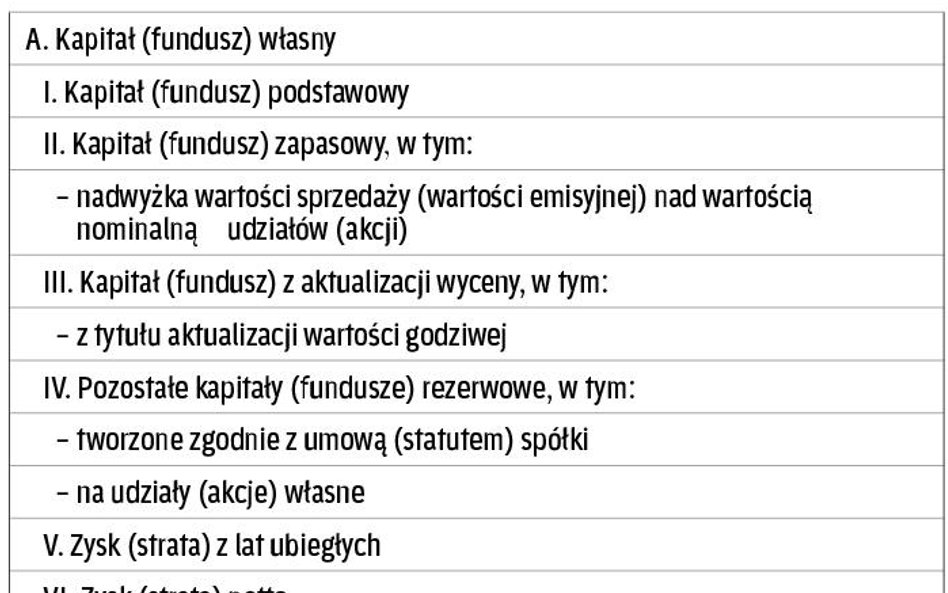 Poszczególne składniki kapitału własnego spółek postawionych w stan likwidacji lub upadłości albo objęte postępowaniem restrukturyzacyjnym należy, na dzień rozpoczęcia likwidacji, postępowania upadłościowego lub restrukturyzacyjnego, połączyć w jeden kapitał podstawowy, zmniejszając go o udziały własne: