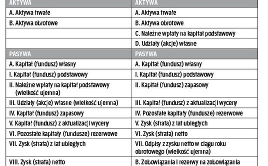 Zasadniczy problem pojawia się przy pozycjach przeniesionych z kapitałów własnych do odrębnych pozycji aktywów (umieszczonych za aktywami obrotowymi). Mowa tu o należnych wpłatach na kapitał podstawowy oraz o udziałach własnych >patrz tabela 1.