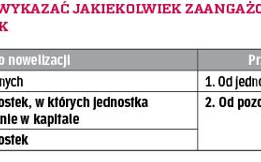 Z innych mniejszych zmian warto wspomnieć o nowej definicji, która może nie utrudni prezentacji danych porównawczych, ale wpłynie na wiele pozycji bilansowych. Nowelizacja uor wprowadza w art. 3 ust. 37d definicję pojęcia „zaangażowanie w kapitale", przez które rozumie się jakikolwiek udział w kapitale innej jednostki, mający charakter trwałego powiązania. Ustawodawca celowo użył słowa „jakikolwiek", aby nie zadziałała tu zasada istotności, która mogłaby ograniczyć informacje przekazywane przez jednostki. Użycie pojęcia „zaangażowanie w kapitale" ma na celu rozbicie dotychczasowych pozycji bilansowych dotyczących należności, zobowiązań czy przychodów finansowych „od jednostek pozostałych". Mechanizm jest prosty, co przedstawia >tabela nr 3.