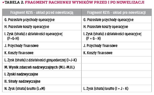 W rachunku zysków i strat zmiany są mniej skomplikowane z punktu widzenia danych porównawczych. Zdecydowano się usunąć z niego operacje nadzwyczajne, które wprowadzały zazwyczaj więcej zamieszania niż powinny (odetchnąć z ulgą mogą również studenci, którzy nie złapią już więcej ujemnych punktów za podchwytliwe pytania na kolokwiach). Teraz każda jednostka musi wykazywać operacje „nadzwyczajne" w segmencie pozostałej działalności operacyjnej. Prezentacja danych porównawczych nie sprawi w tym przypadku kłopotów – przekształcenie polega na zwykłym przeniesieniu zysków i strat nadzwyczajnych do pozostałych przychodów i kosztów operacyjnych oraz na opisaniu tej zmiany w informacji dodatkowej. Zmiana ta spowodowała, że ze sprawozdania finansowego zniknęła pozycja „Zysk z działalności gospodarczej", którą zastąpi „Zysk brutto" >patrz tabela 2.
