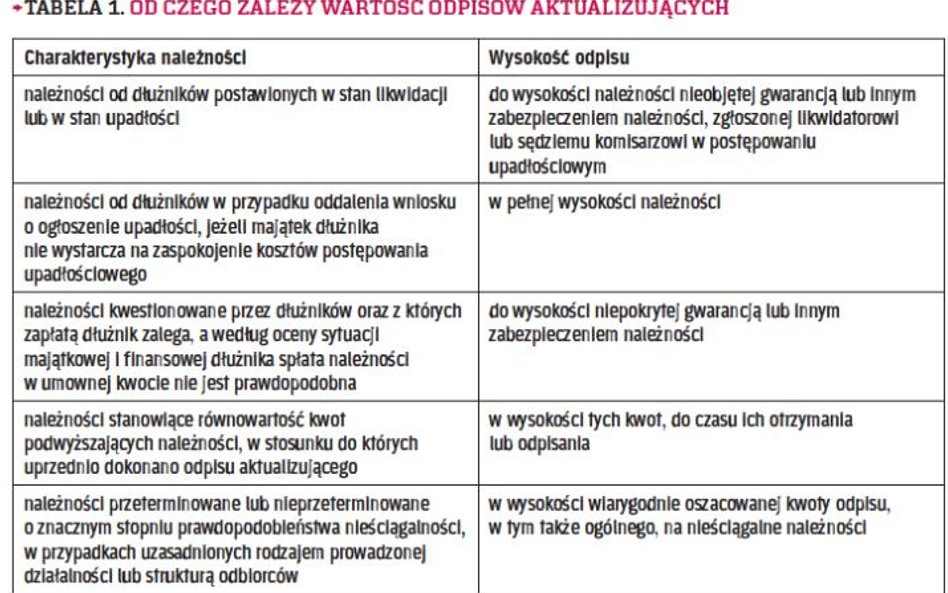 Polityka rachunkowości jednostki powinna określać sposób tworzenia odpisów aktualizujących należności. Zazwyczaj pełnym odpisem – 100 proc. wartości należności – obejmuje się należności przeterminowane powyżej roku. Z kolei należności przeterminowane powyżej pół roku do roku mogą być objęte odpisem aktualizującym w wysokości 50 proc. wartości należności.