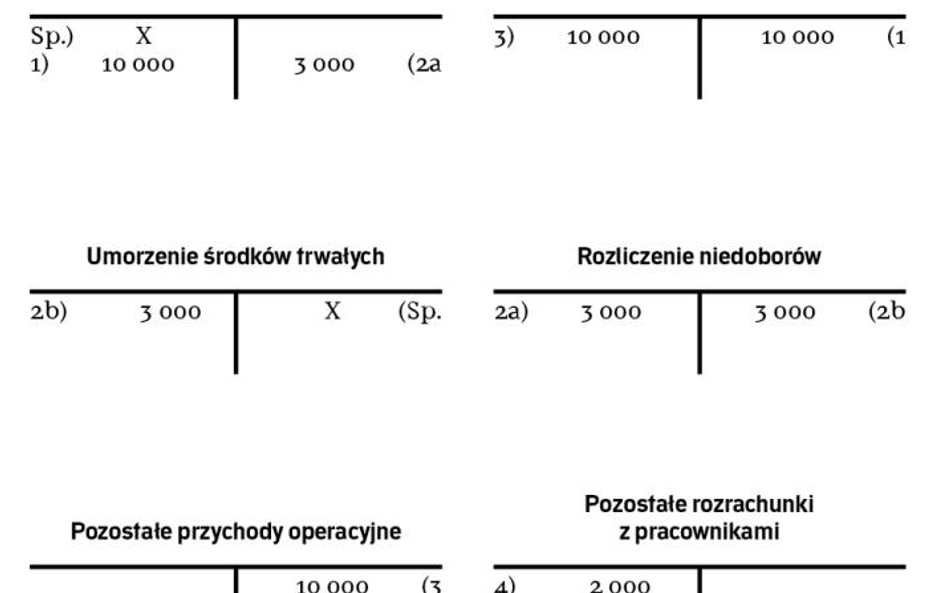 W przypadku stwierdzenia niedoborów środków trwałych całkowicie umorzonych na koncie „Rozliczenie niedoborów" ujmowane jest wyłącznie wyksięgowanie wartości początkowej i umorzenia w tych samych kwotach po stronie Wn i Ma. Gdy niedobór umorzonego w całości środka trwałego zostanie uznany za zawiniony, należy dodatkowo zaksięgować roszczenie na koncie rozrachunków z pracownikami, w korespondencji z pozostałymi przychodami operacyjnymi.