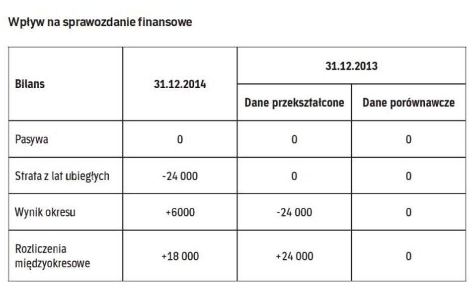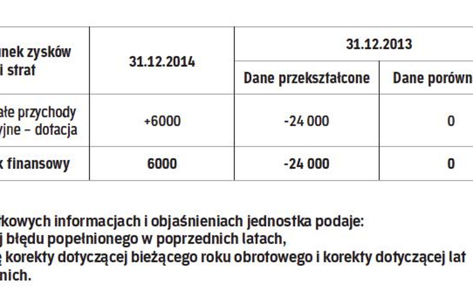 2. Jeżeli natomiast błąd dotyczy lat ubiegłych i jest to błąd istotny, a informację o nim jednostka otrzymała przed zatwierdzeniem sprawozdania za rok 2014, to powinna odnieść kwotę korekty w poczet kapitału własnego i wykazać jako stratę z lat ubiegłych, ująć w odpowiedniej pozycji zestawienia zmian kapitału (funduszu) własnego (jeżeli jednostka jest zobowiązana do jego sporządzania) oraz przekształcić dane w sposób retrospektywny, aby zachować ich porównywalność. Ponadto spółka powinna pamiętać, aby opisać błąd w dodatkowych informacjach i objaśnieniach. Zgodnie z punktem 5.8 KSR 7 jednostka powinna ujawnić w dodatkowych informacjach i objaśnieniach następujące informacje: