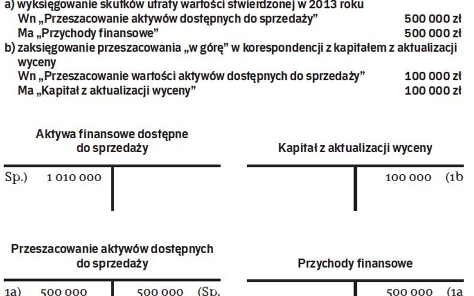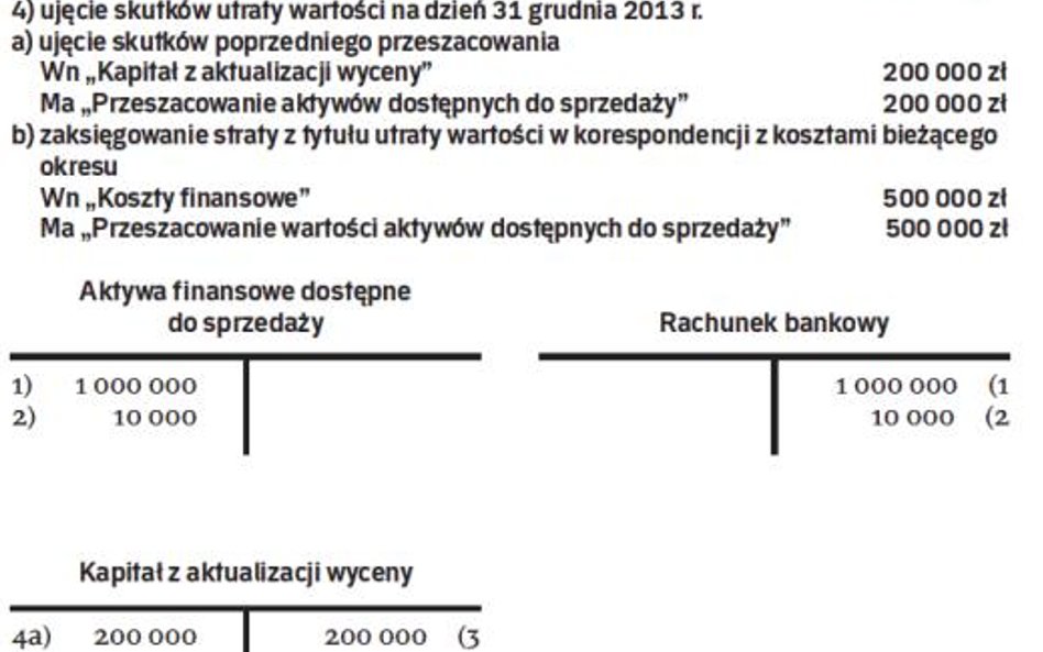 15 lutego 2013 r. spółka Alfa S.A. kupiła akcje spółki Beta S.A. za kwotę 1 000 000 zł (10 000 akcji o wartości nominalnej 100 zł każda). Prowizja maklerska od przeprowadzonej transakcji wyniosła 1 proc., czyli 10 000 zł. Spółka zaklasyfikowała akcje jako aktywa finansowe dostępne do sprzedaży. Pod koniec czerwca 2013 r. cena rynkowa akcji Beta S.A. wynosiła 120 zł za sztukę, natomiast na koniec roku 2014 ich wartość spadła do 50 zł za każdą akcję. Spadek cen akcji spółka potraktowała jako przesłankę do uwzględnienia utraty wartości i zdecydowała o ujęciu odpisu aktualizującego wartość akcji. Pod koniec 2014 r. odnotowano wzrost wartości rynkowej ceny akcji do 110 zł za sztukę.