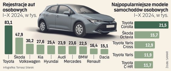 Obawa przed spodziewanymi w przyszłym roku podwyżkami cen winduje popyt na samochody. Jak podaje Instytut Samar, po dziesięciu miesiącach 2024 r. liczba rejestracji nowych aut osobowych wyniosła 446,7 tys. i w porównaniu z ubiegłym rokiem jest wyższa o przeszło 14 proc. W samym październiku sprzedaż sięgnęła 48,1 tys. sztuk i okazała się o niemal 18 proc. większa niż miesiąc wcześniej, zarazem będąc wynikiem o 16 proc. lepszym w porównaniu z tym samym miesiącem w ubiegłym roku. Prognozy zakładają, że do końca grudnia tegoroczny rynek zamknie się liczbą ok. 550 tys. aut w porównaniu z 475 tys. zarejestrowanych w ubiegłym roku. Ale niewykluczona jest korekta spodziewanego wyniku w górę.
